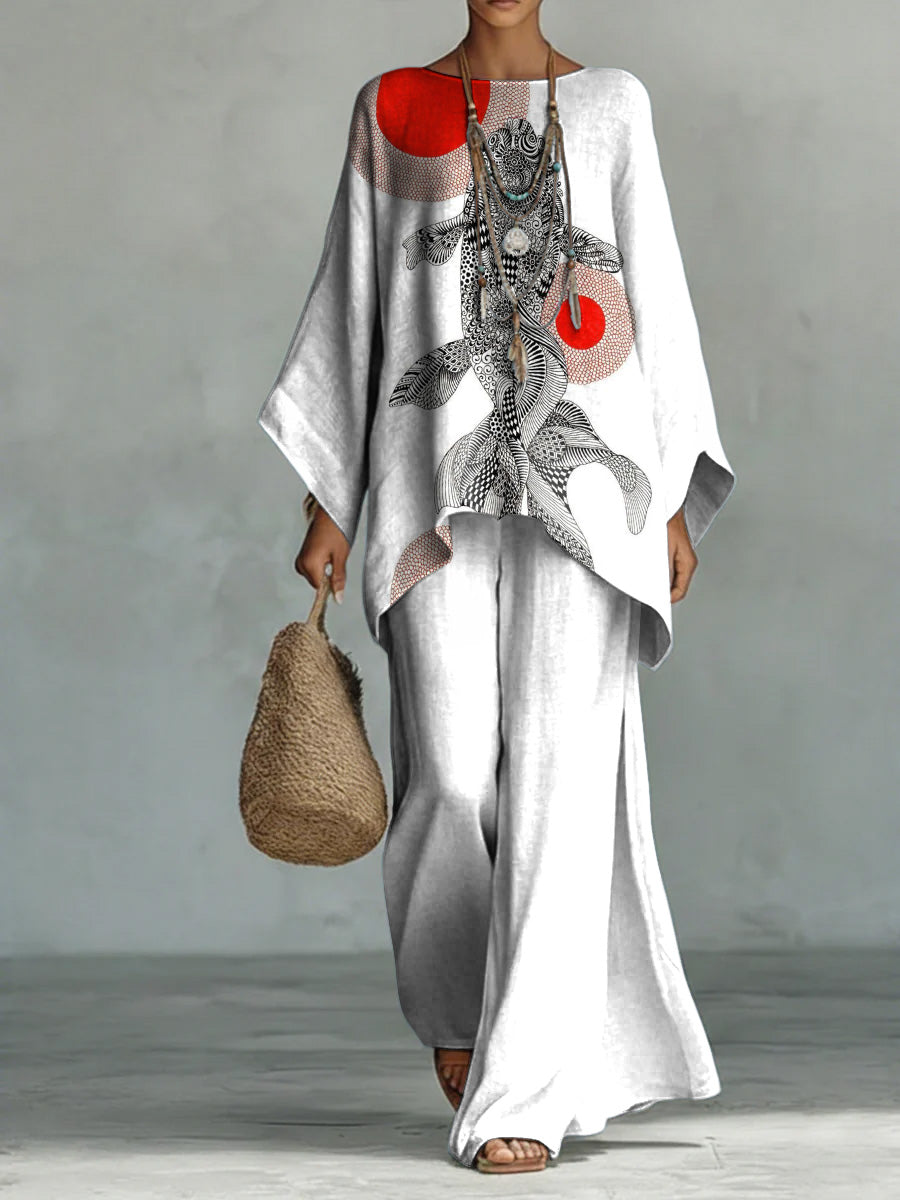 Fish Decorative Pattern Casual Long Sleeve Linen And Cotton Top And Pants