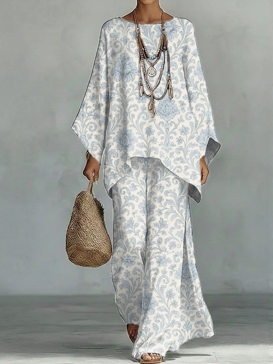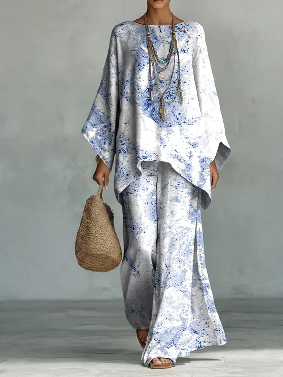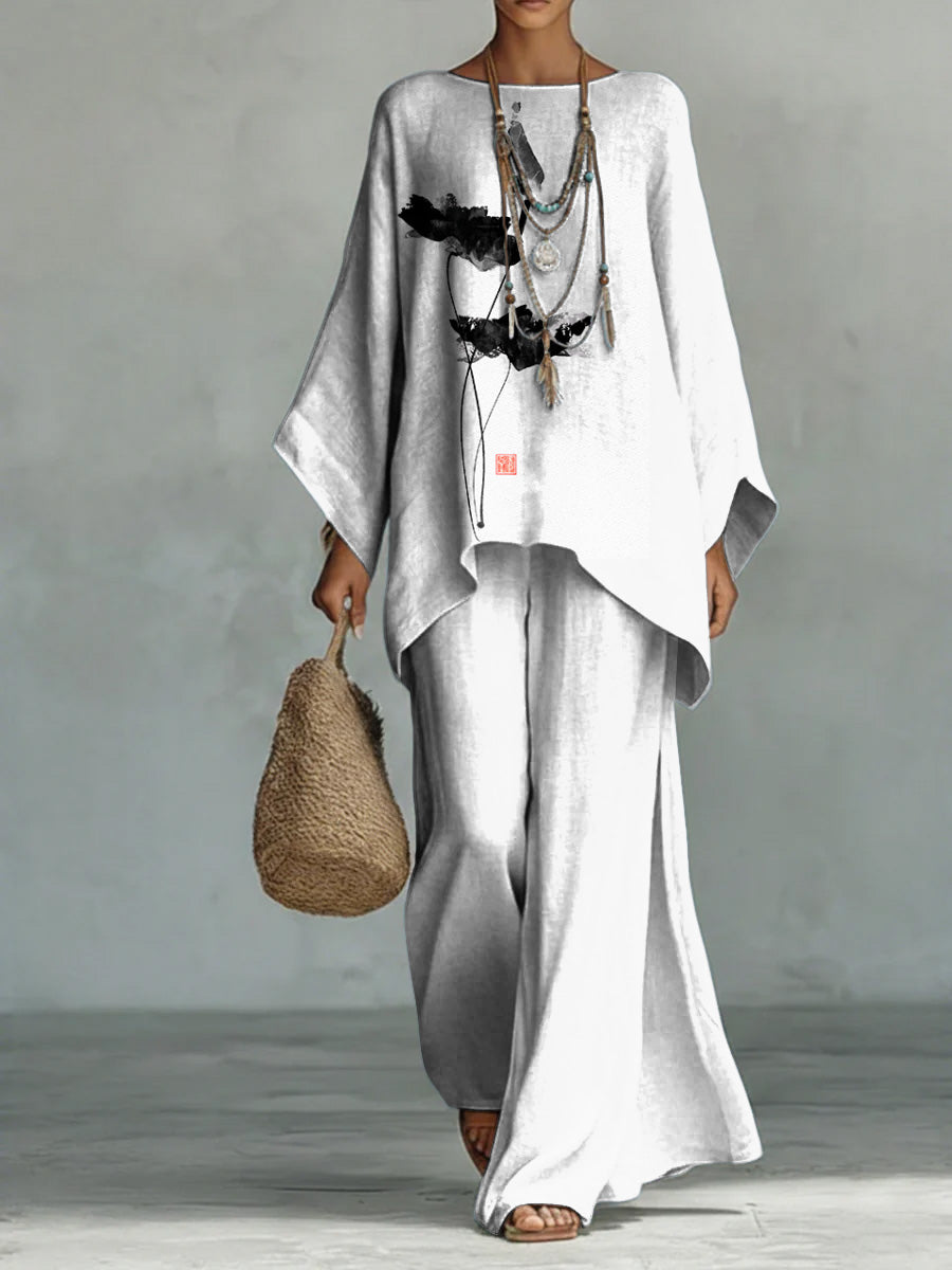 Women's Comfortable and loose print pattern cotton and linen wide-leg pants two-piece set