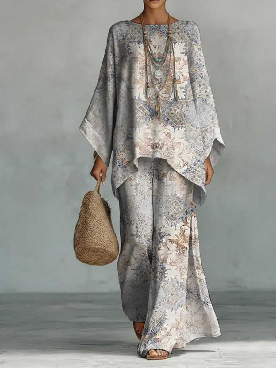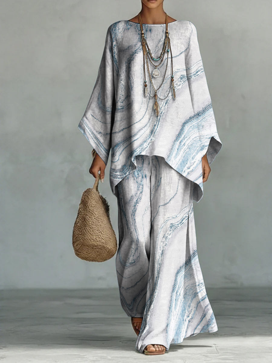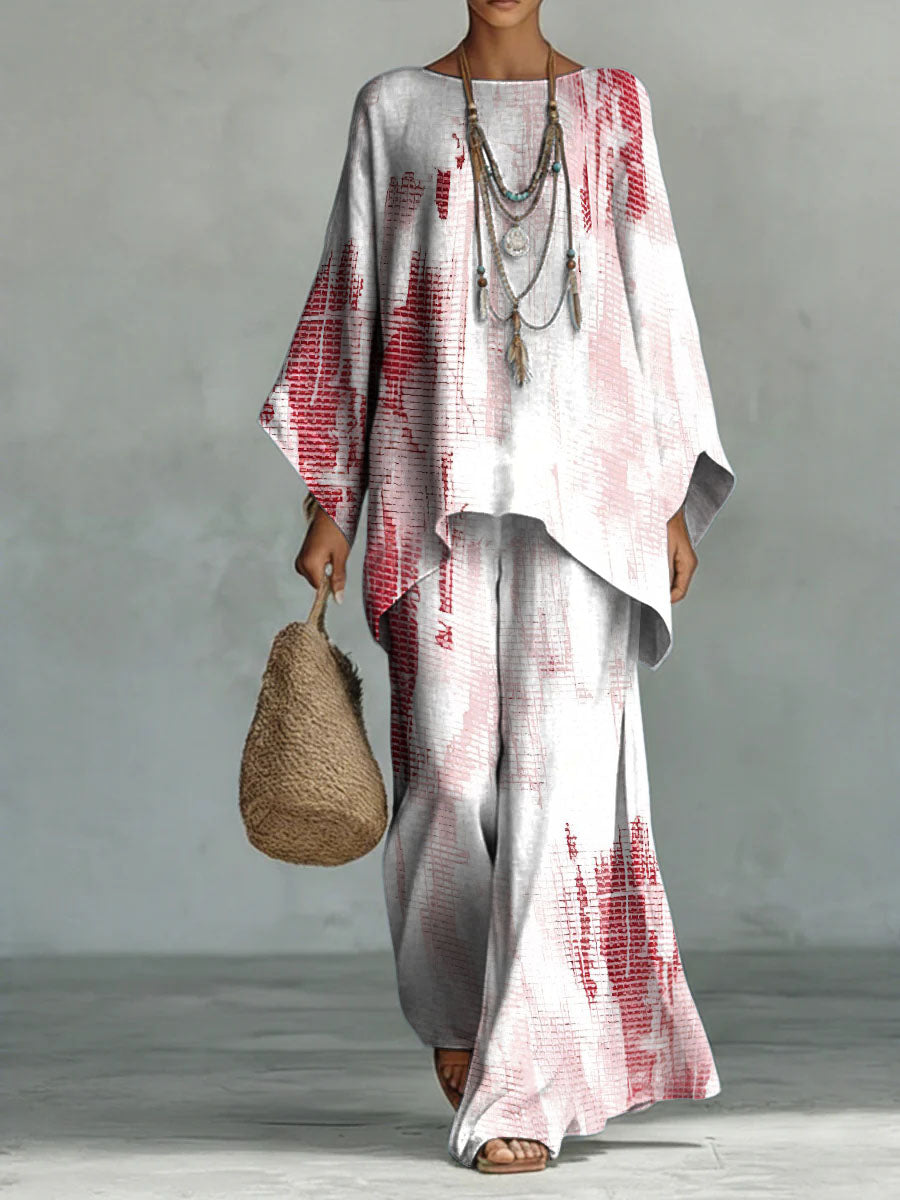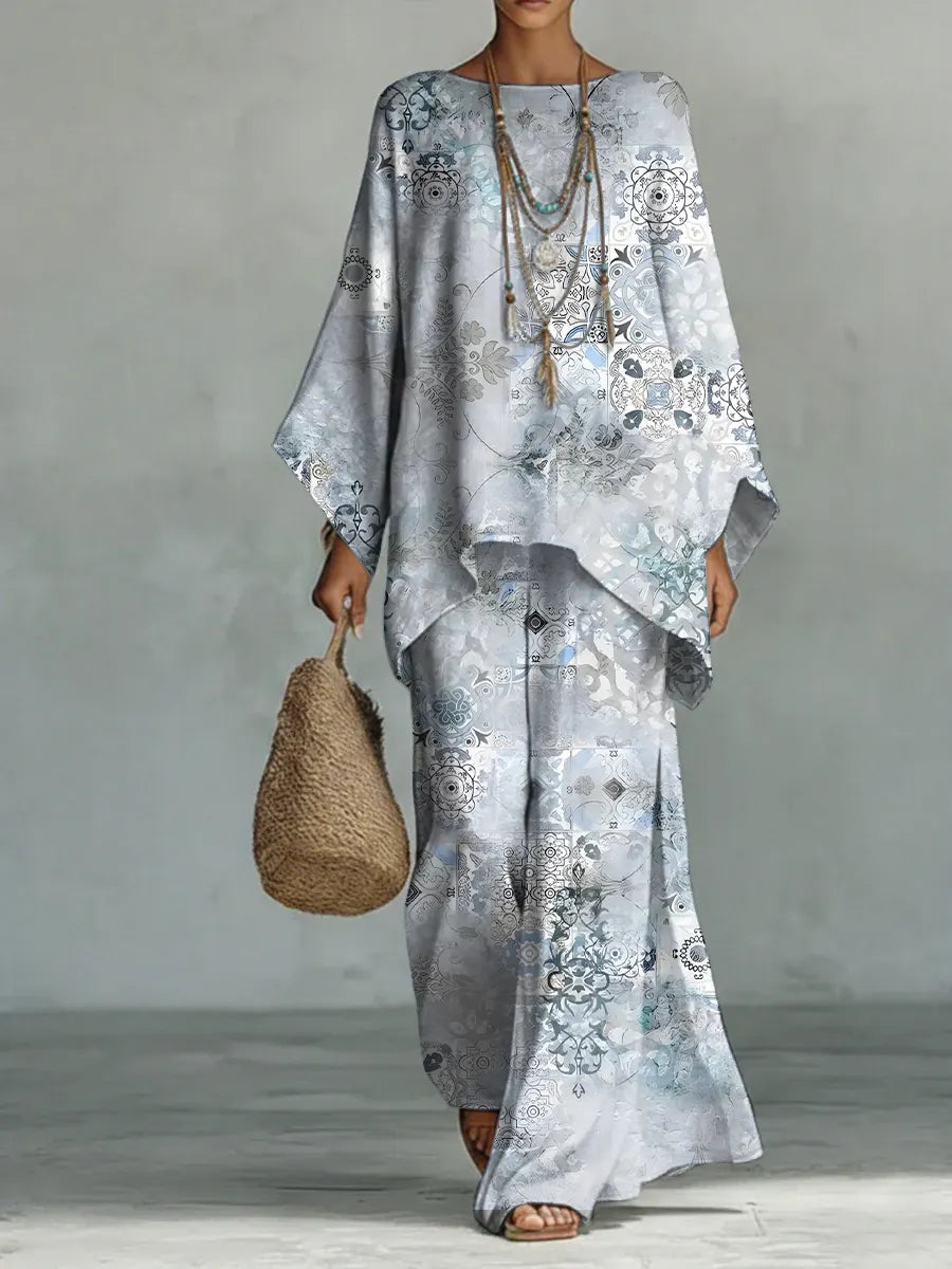 Women's Comfortable and loose print pattern cotton and linen wide-leg pants two-piece set
