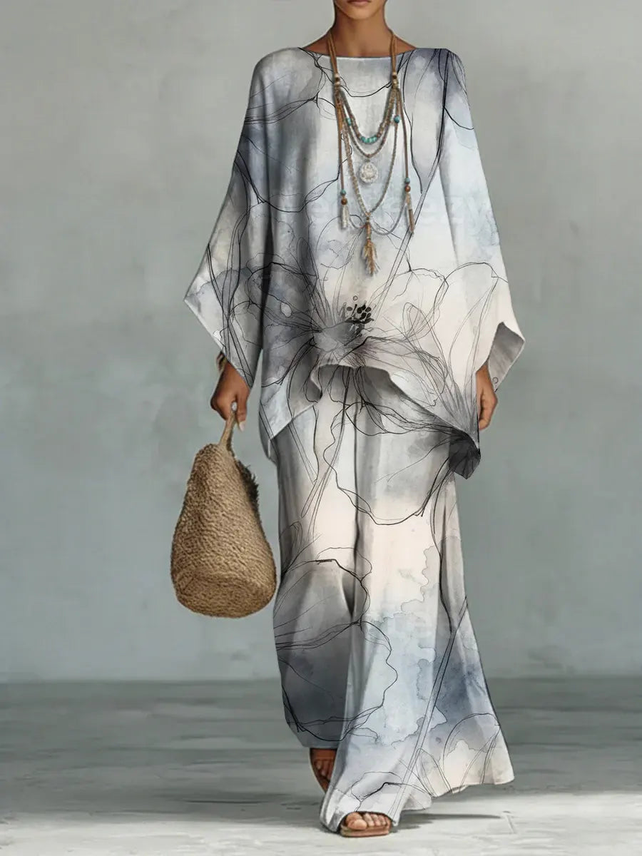 Women's Line Floral Art Print Casual Cotton Linen Suits