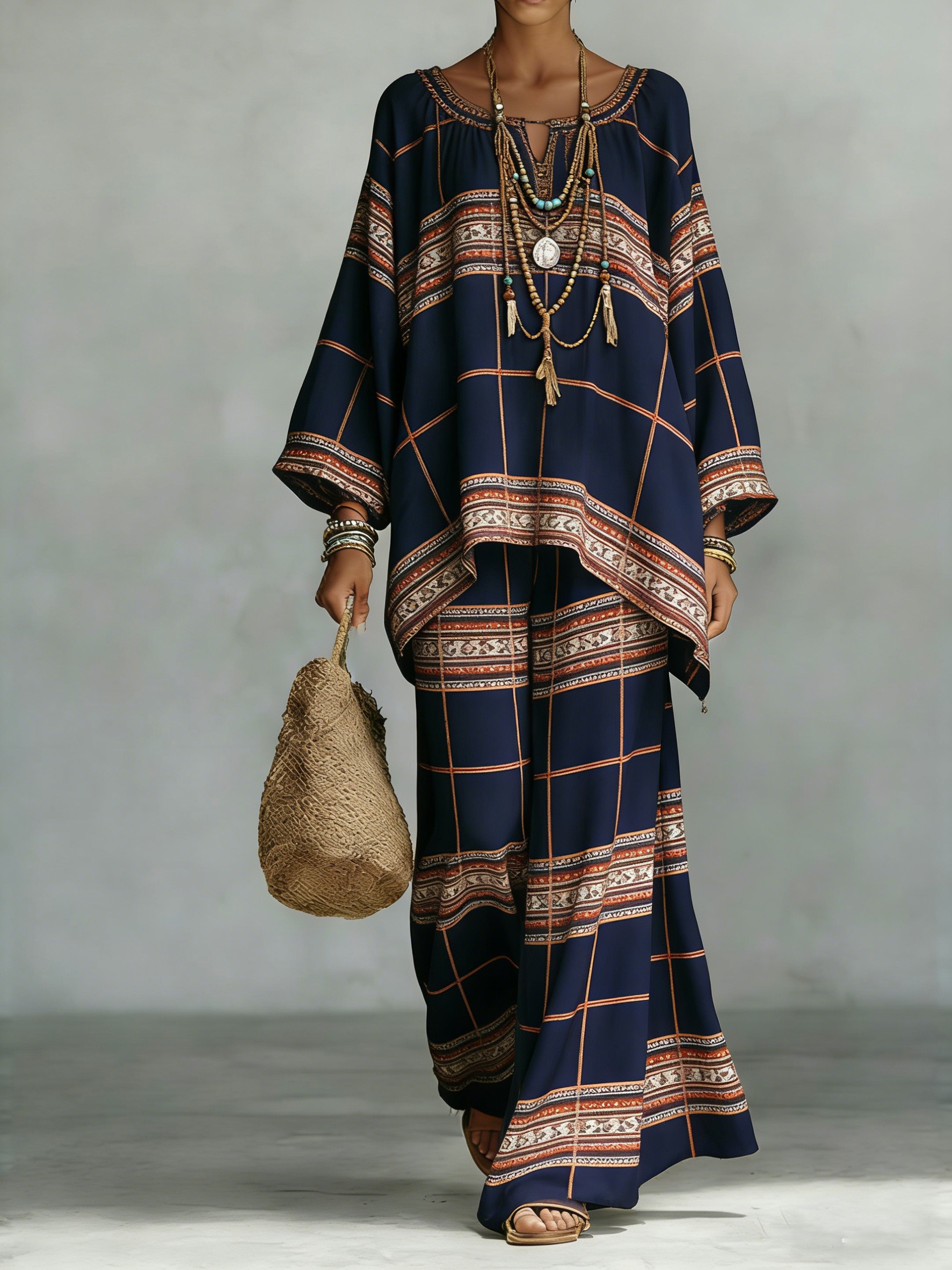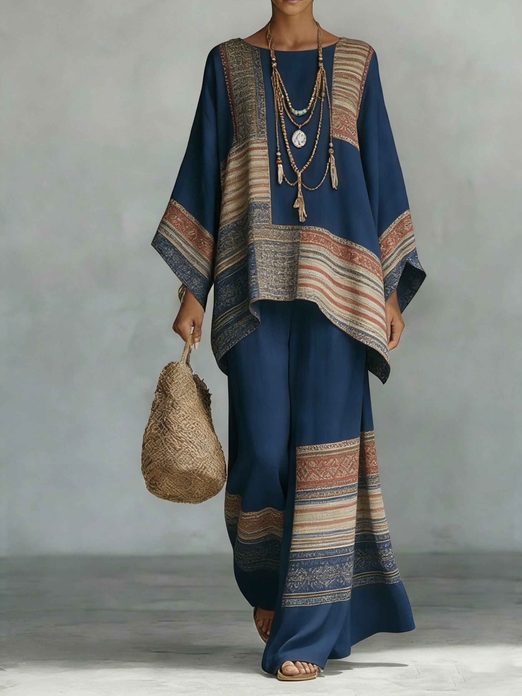 Women's Retro Lines Print Linen Cotton Top And Wide-leg Pants Two-piece Set.
