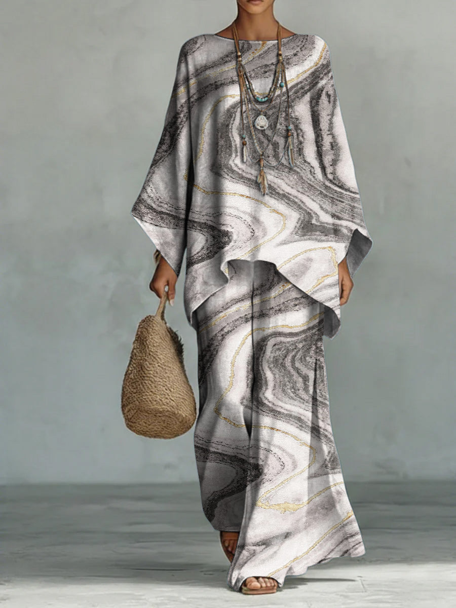 Gradient-colored Wavy Line Decorative Pattern Casual Long Sleeve Cotton Linen Top And Pants