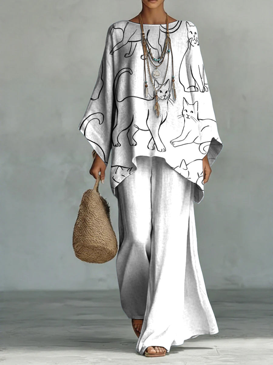 Fun Cat Decorative Patterns Casual Long Sleeve Cotton Linen Top And Pants
