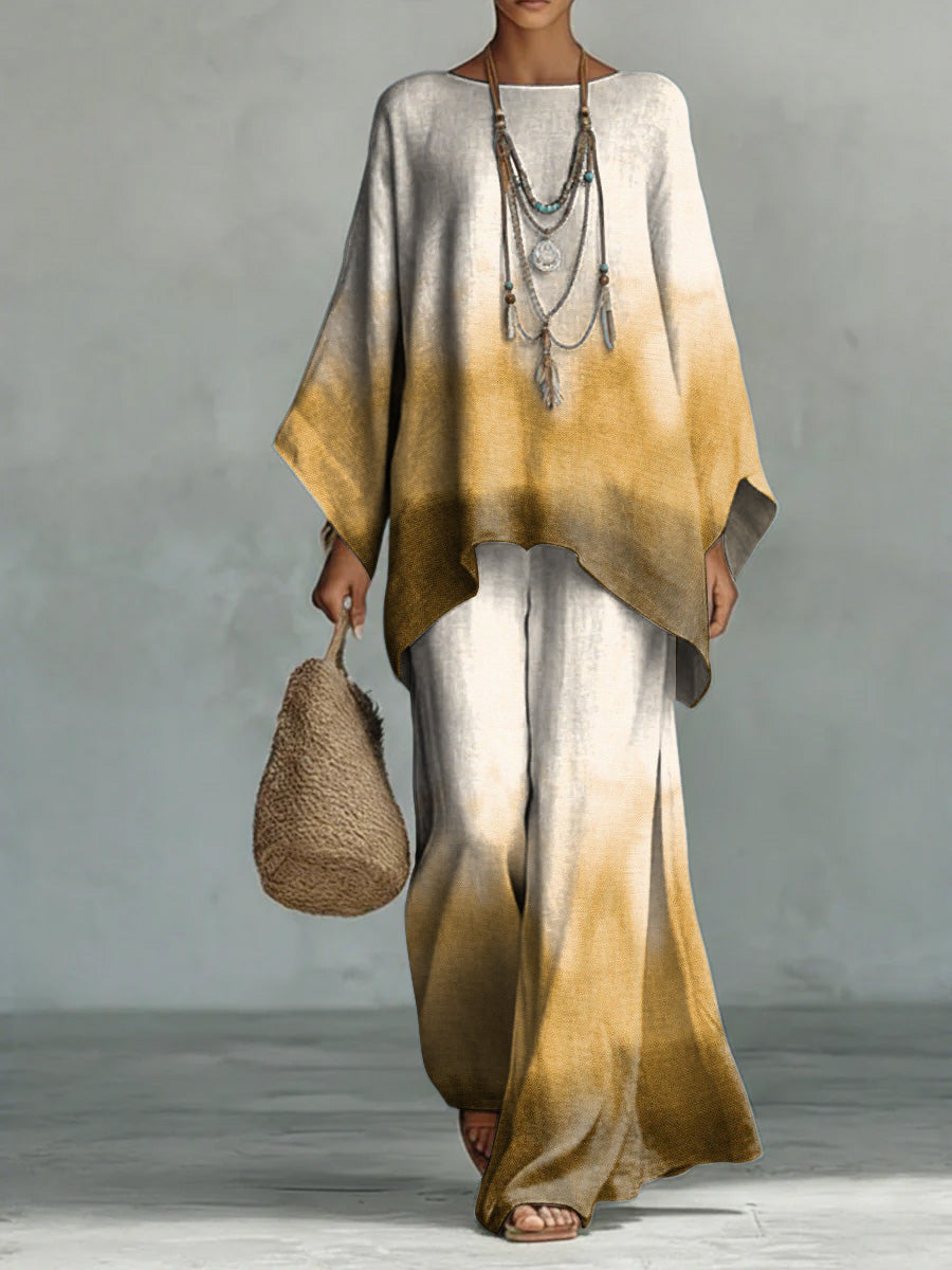 Gradient Art Painting Decorative Patterns Casual Long Sleeve Cotton Linen Top And Pants